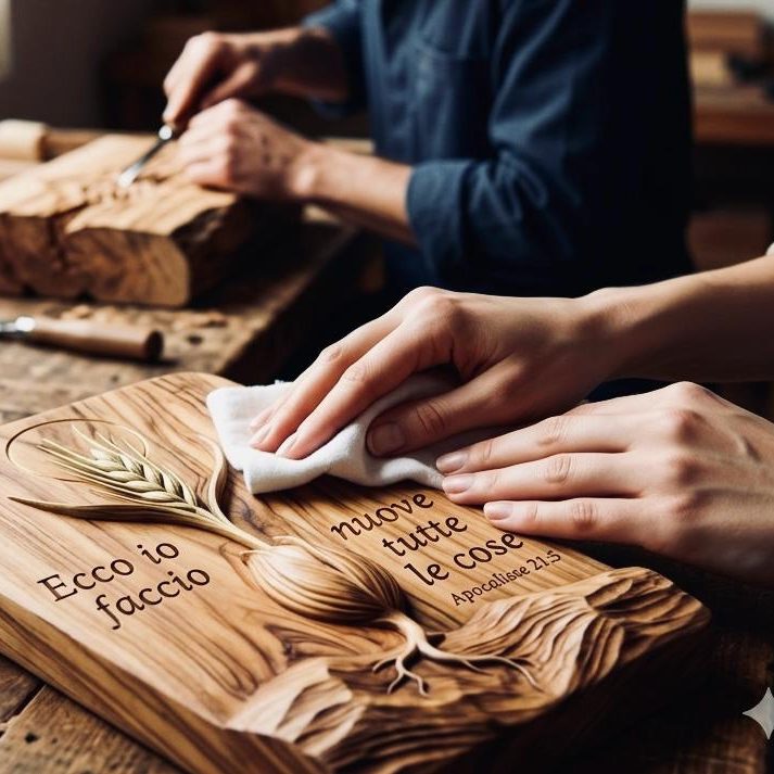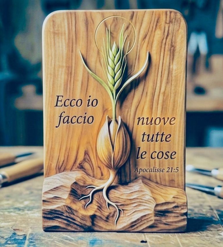 In jedem Stück Holz, das wir auswählen, versuchen wir, ein Wort des Glaubens sprechen zu lassen. Es ist ein Weg, den wir als Ehepaar gemeinsam gehen, um die Schönheit zu teilen, die Gott geschaffen hat. Wir verwandeln dieses natürliche Element in eine Einladung zur Reflexion und zum Gebet, um Sein Wort und Sein Licht in die Häuser zu tragen.
